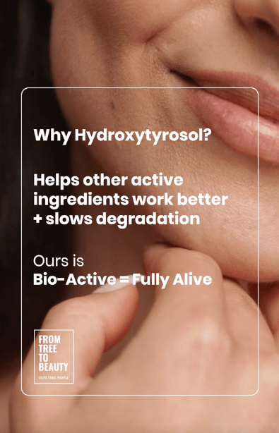 At Olive Tree People (Oliveda), hydroxytyrosol is the foundation of their skincare formulations. Unlike many conventional products that rely on water as a base, Oliveda skips fillers and focuses on bioavailable, plant-active ingredients that actually do something for your skin.